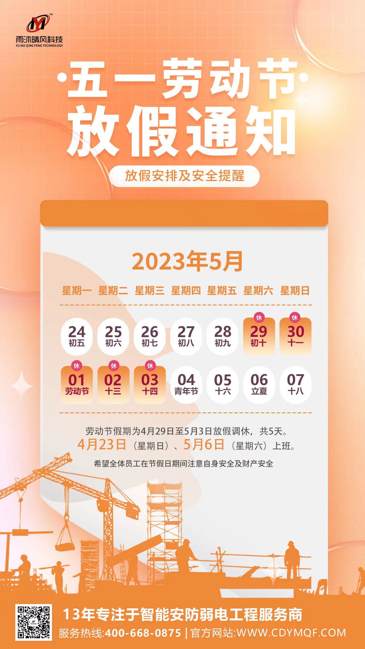 五一勞動節又叫做五一國際勞動節,是一種國際性的節日。對于我們來說勞動節的意義在于勞動者通過斗爭,用頑強、英勇不屈的奮斗精神,爭取到了自己的合法權益,是人類文明民主的歷史性進步,這才是五一勞動節的精髓所在。所以,人們才這么注重勞動節。 勞動不僅有關人的健康和智慧,也有關人的快樂和美好。 勞動使我們生活豐富多彩,勞動鍛煉和造就了我們人類。 人的偉大其實就在于會勞動、能勞動和愛勞動,沒有勞動的人生是毫無意義的,能體現勞動的生活是充滿幸福的。 值五一勞動節來臨之際,根據國務院辦公廳公布的《2023年節假日安排通知》要求,結合我公司實際情況,現對我公司2023年勞動節放假做如下安排:一、 勞動節放假時間定為:2023年4月29日(星期六)-2023年5月3日(星期三),共5天,2023年4月23日(周日)、2023年5月6日(周六)正常上班調休。二、 各部門接通知后,請妥善安排好各項目現階段施工進度。 最后,成都雨沐晴風科技的弱電殼子哥在此預祝大家五一勞動節快樂。