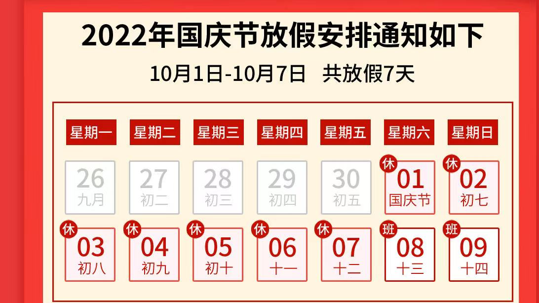 10月1日國慶節是我們國家的生日,是新中國成立的開始,對我們來說是一個莊重而喜慶的日子,承載了我們國家民族的凝聚力。同時國慶日上的大規模慶典活動,也是政府動員與號召力的具體體現。 每年國慶,我們都會舉行盛大的慶祝活動,以加強我國人民的愛國意識,增強國家的凝聚力。那么大家知道國慶節除了國慶長假還有哪些習俗嗎?下面就跟著成都工廠弱電公司雨沐晴風科技的小編一起了解了解吧!(1)張燈結彩 我國每逢國慶佳節,各企事業單位都會掛起燈籠或橫幅來慶祝國慶;廣場上也會擺放著標語字樣的盆景和氫氣球,用歡樂的氣氛來迎接國慶。(2)國慶閱兵 1949年至1959年期間,我國閱兵時間為一年一閱兵。到了1960年,我國國務院本著厲行節約、勤儉建國的方針,決定改革國慶典禮制度,實行“五年一小慶、十年一大慶,逢大慶舉行閱兵”。閱兵,歷來是一個國家展示實力、鼓舞士氣的重要軍事儀式,對于彰顯國威軍威,增強民族凝聚力和自豪感,其具有重要意義。我國從1949年開國大典閱兵,截止2022年,共舉行了15次國慶大閱兵。(3)國慶聯歡會 國慶前后,各企事業單位為了慶祝國慶,弘揚企業文化,都會組織員工開展迎國慶聯歡會,用文藝表演的形式來表達國慶的喜悅。(4)國慶長假 每年10月1日是我國的國慶節,我國于1999年修訂發布《全國年節及紀念日放假辦法》,將國慶節與相鄰的周六、日組合為7天的國慶長假,被稱之為“國慶黃金周”,用放假的形勢,讓我國同胞們共同感受國慶的歡樂。(5)高速公路免費 隨著人民生活水平的日益提高,私家車已日益普及,人們通常會利用國慶7天長假來游覽祖國的大好河山。因此,國家自2012年起,國慶期間的高速公路向私家車免費通行。2022年國慶節假期免費通行時間為10月1日0時至10月7日24時。 以上便是我國國慶節的習俗,下面將是小編的公司對于2022年國慶節的放假通知與安排。 最后在這個特別美好的日子里,讓我們所有的華夏兒女共祝愿:祖國面貌日日新人民生活步步高! !!成都工廠弱電公司雨沐晴風科技也在此祝大家:祝國慶節快樂! !!