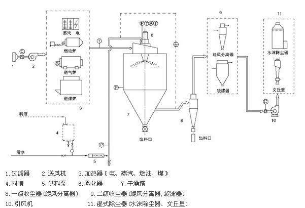 空氣通過過濾器和加熱器,進(jìn)入干燥器頂部的空氣分配器,熱空氣呈螺旋狀均勻進(jìn)入干燥器。料液由料液槽經(jīng)過濾器由泵送至干燥器的離心霧化器,使料液噴成績效的霧狀液滴,料液和熱空氣并流接觸水分迅速蒸發(fā),在短時(shí)間內(nèi)干燥為粉末狀成品。成品由于干燥塔地步和旋風(fēng)分離器排除,廢棄由風(fēng)機(jī)排出。