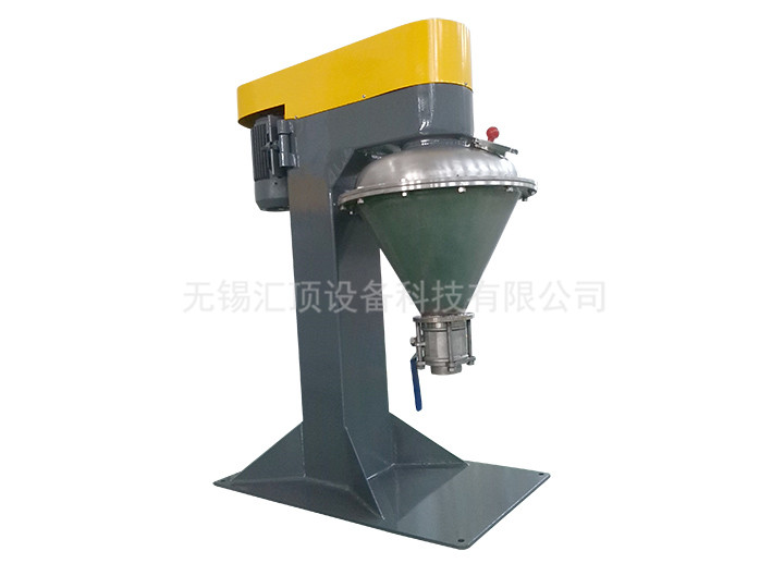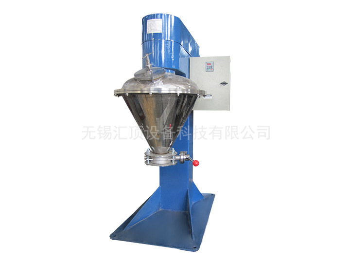VC混合機(jī)由擺線減速機(jī)連接中心螺桿及外層螺帶以相同轉(zhuǎn)速運(yùn)轉(zhuǎn)。工作時(shí)中心螺桿將混合物料由底部提升到頂部,同時(shí)線速度較大的外部螺帶將物料由下向上沿錐形桶壁盤提升,兩種運(yùn)動(dòng)在離心力作用下又將物料沿切線方向拋向空間,物料產(chǎn)生強(qiáng)烈的對(duì)流剪切、擴(kuò)散,從而達(dá)到快速混合的目的(中心螺桿也可做成反向螺桿)。